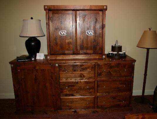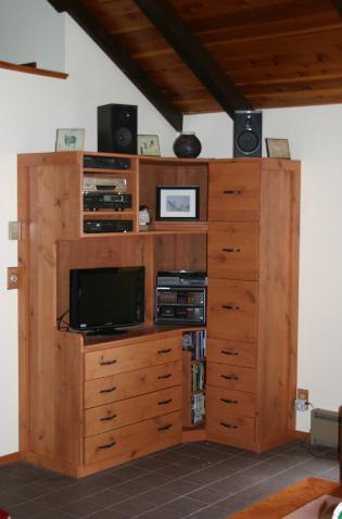 Western media center with shelves for components and drawers for DVD storage behind doors.