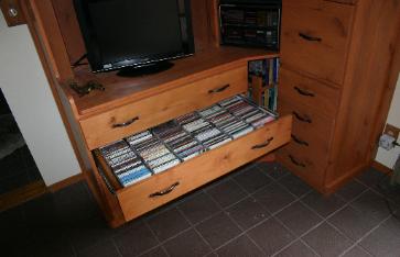 Western media center with shelves for components and drawers for DVD storage behind doors.